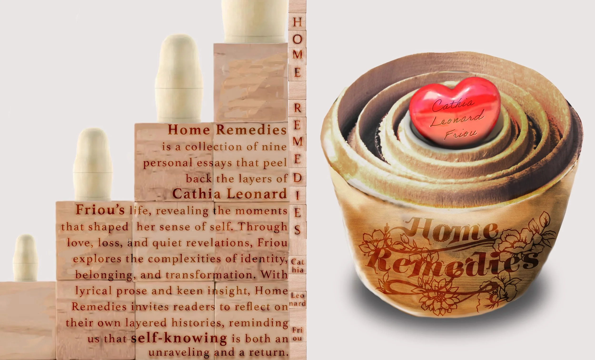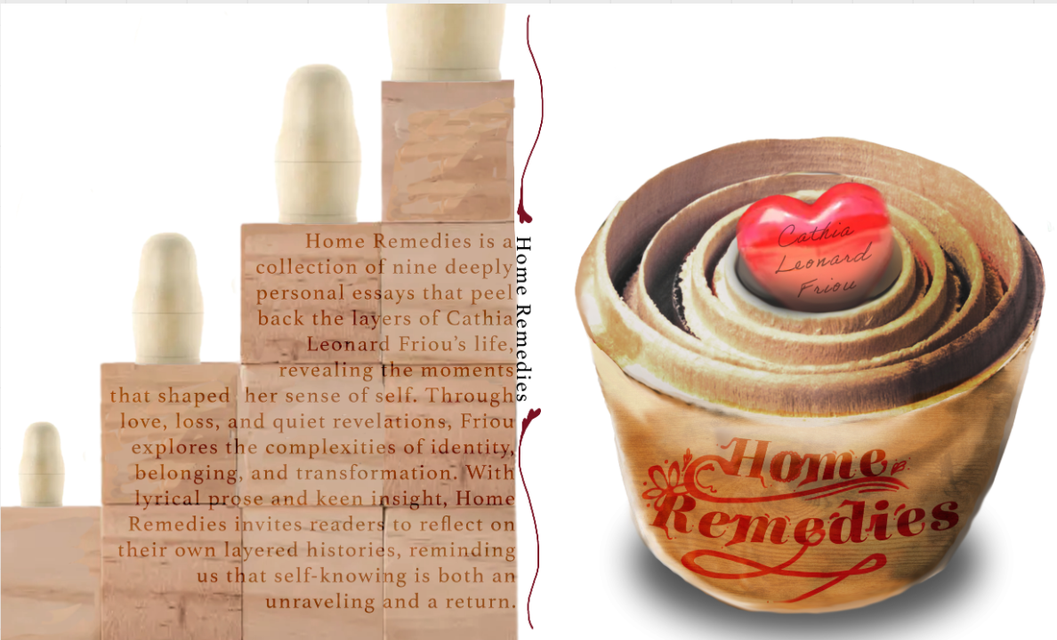 Home Remedies is a collection of nine personal essays that peel back the layers of Cathia Leonard Friou’s life, revealing the moments that shaped her sense of self.